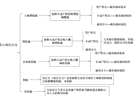 因此對于設立項目公司的三種方式而言,不動產出資和新設分立均可享受土地增值稅的稅收優惠,但前提是交易雙方均不是地產開發企業,而資產轉讓的方式因為不享有土地增值稅收優惠,是三種方式中稅負最重的。