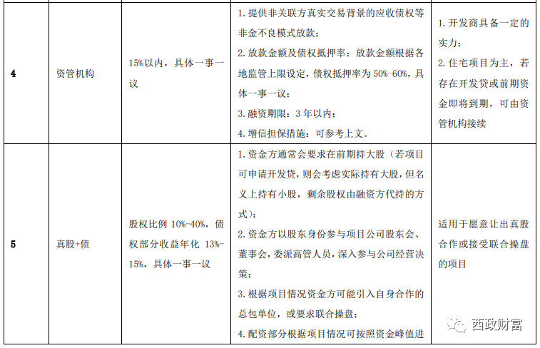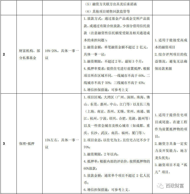 目前市面上能操作中小開發(fā)商融資業(yè)務(wù)的資金機構(gòu),除了前文提到的一些依托于開發(fā)商背景的資金機構(gòu)及大型的地產(chǎn)投資機構(gòu)外,還包括一些小貸機構(gòu)、三方財富公司及少部分私募基金、個人金主、少部分國央企背景的資金及資產(chǎn)管理機構(gòu)(非金不良模式)。其中小貸機構(gòu)的成本一般集中在年化16%-18%,三方財富公司及少部分私募基金因其資金受限于資金募集(當(dāng)前產(chǎn)品形式受限、私募等機構(gòu)頻繁爆雷增加了募集難度),其成本一般在年化18%-20%左右,個人金主的融資成本相對更高一些,但該類資金往往可以接受項目下沉到三四線城市。另外,依托于開發(fā)商背景的資金機構(gòu)、大型的地產(chǎn)投資機構(gòu)以及少部分國央企、資產(chǎn)管理機構(gòu)因為其資金主要是自有資金,其融資成本則相對低一些,普遍在年化15%左右,當(dāng)然對于優(yōu)質(zhì)的主體并提供前置抵押的情況下,融資成本可到年化12%-13%,或者更低。