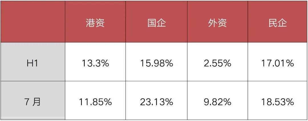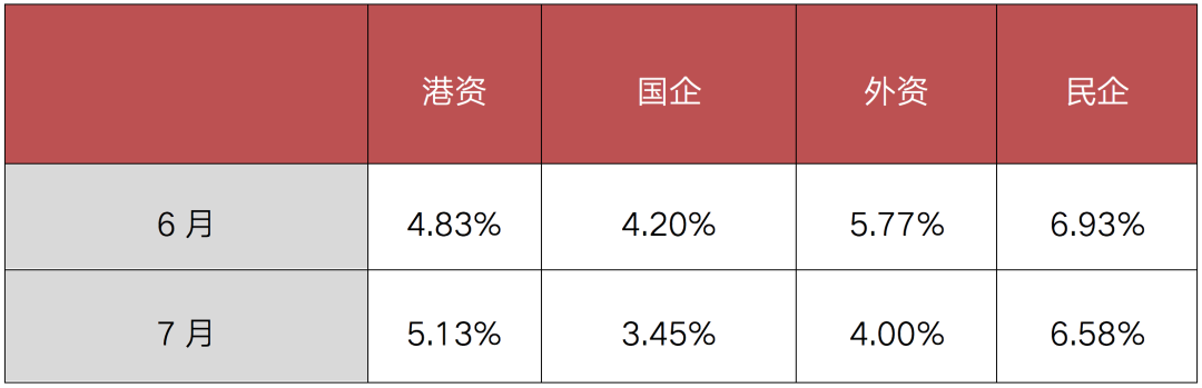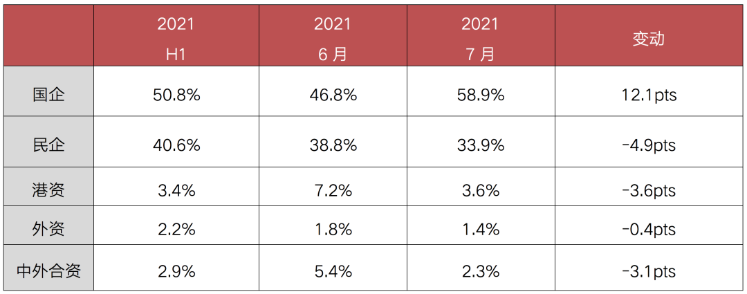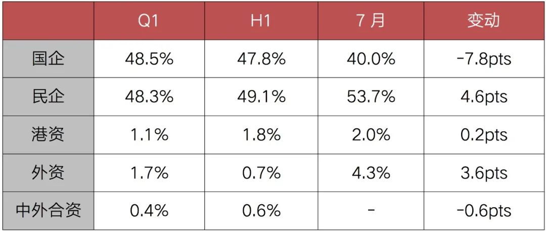從企業性質方面看,民企拿地投資勢頭連續回升,投資占比由一季度的48.3%上半年提升至49.1%,7月更是回升至53.7%。國企方面,7月拿地投資占比較上半年有小幅下降,40%為今年最低,在8、9月集中供地后有望有所恢復。