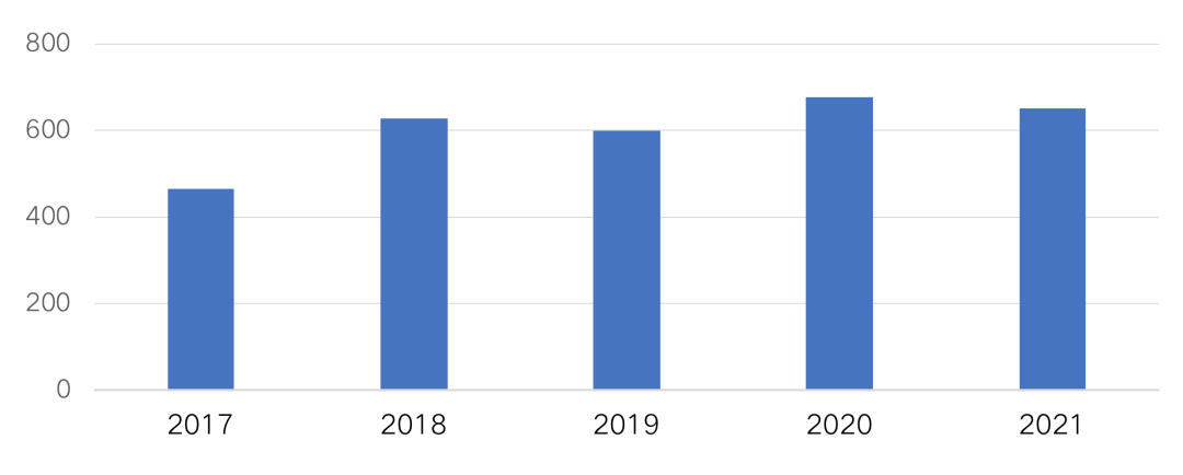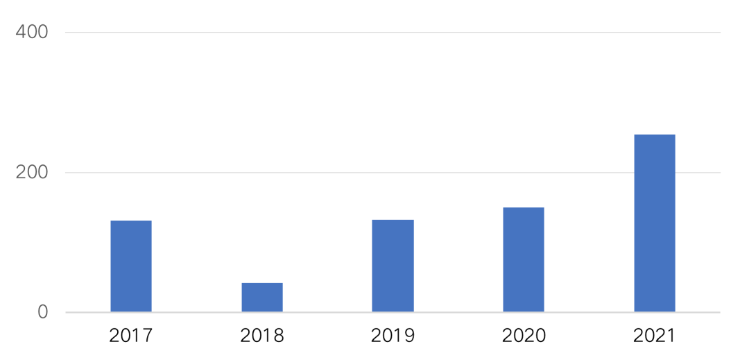 圖:2017-2021年7月房企海外債總額(億元人民幣)