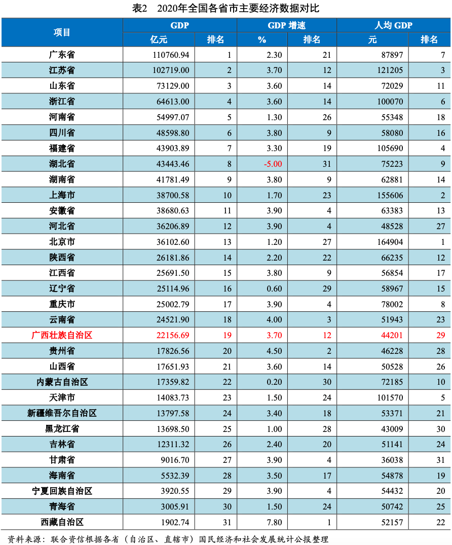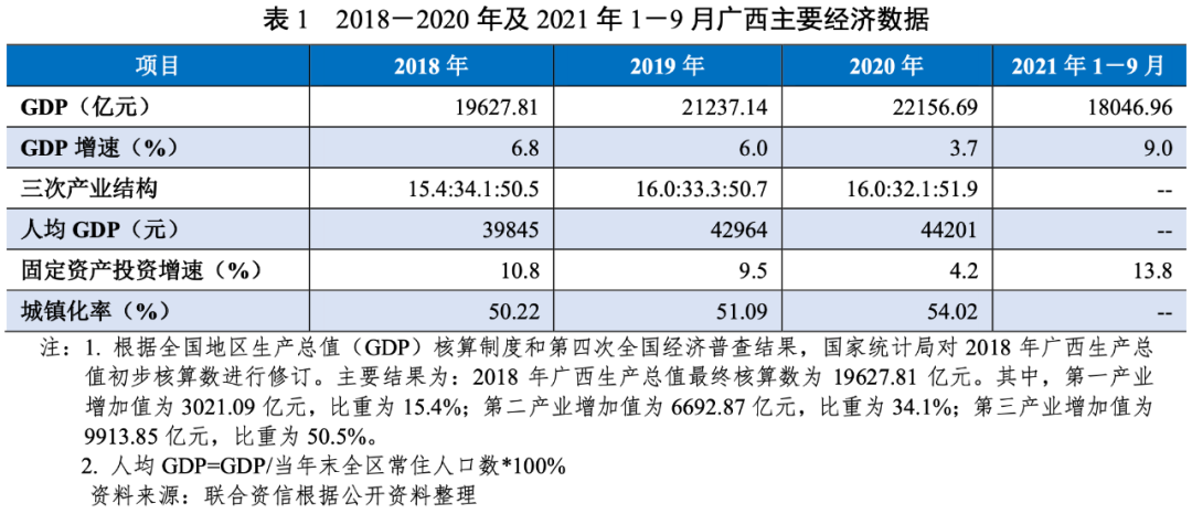 廣西壯族自治區(以下簡稱“廣西”)地處中國西南部,經濟總量處于全國中下游水平,人均GDP排名靠后。2020年,受新冠肺炎疫情影響,廣西經濟增速及固定資產投資增速均明顯放緩。2021年前三季度,廣西經濟增速及固定資產投資增速均同比大幅增長。