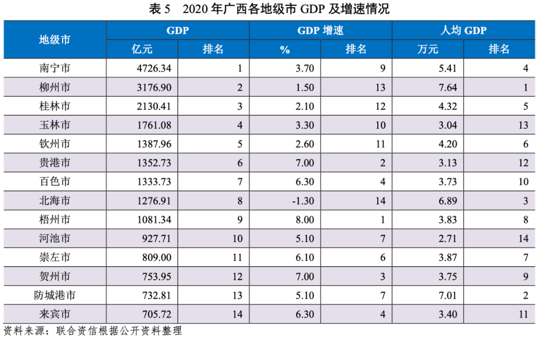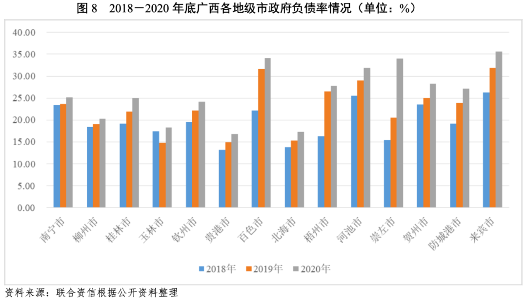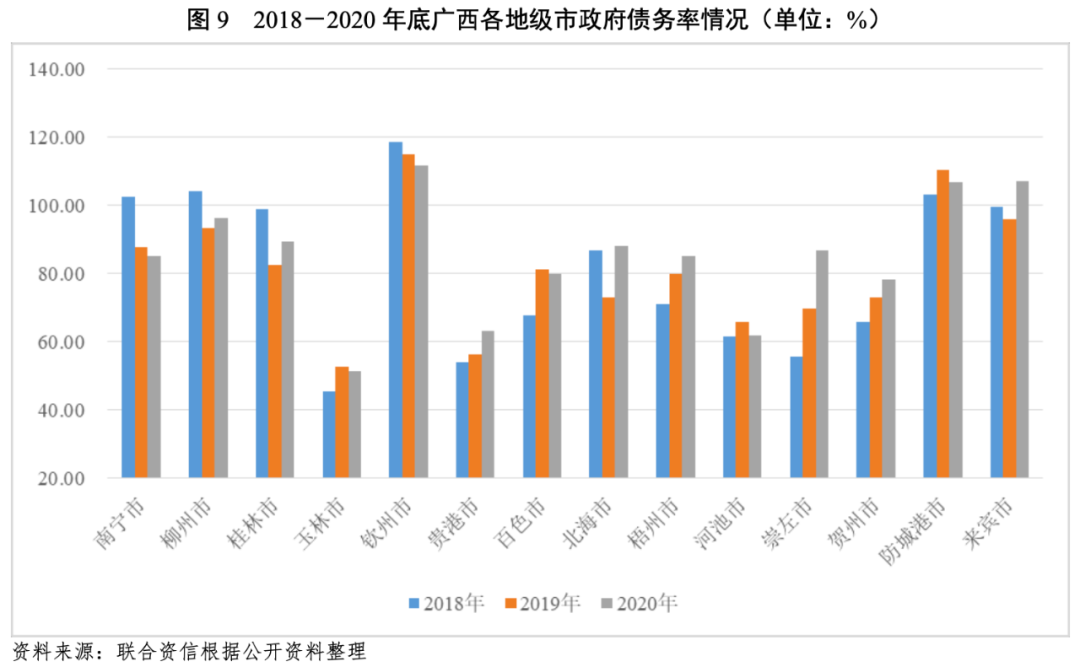 債務負擔方面,截至2020年底,各地級市政府負債率均有所提升,但整體債務負擔相對較輕。其中,崇左市政府負債率較上年底提升13.49個百分點,來賓市、玉林市、防城港市、賀州市和桂林市政府負債率均較上年底提升3~4個百分點,其他8個地級市政府負債率均較上年底提升1~3個百分點。截至2020年底,來賓市、百色市、崇左市和河池市政府負債率高于30%。