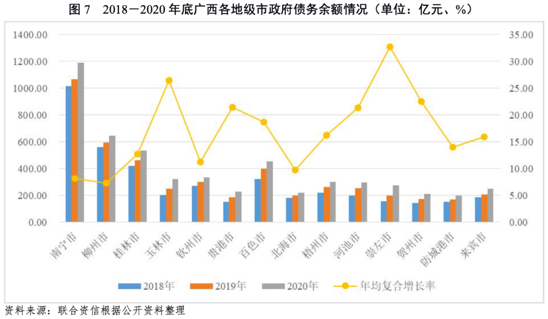 從債務層面看,廣西各地級市中,南寧市政府債務規模最大,為1189.94億元;隨后是柳州市、桂林市、百色市、欽州市和玉林市,以上5個地級市政府債務余額均在300~700億元之間。2018-2020年底,廣西各地級市政府債務余額均呈上升趨勢,其中崇左市政府債務余額增長最快,年均復合增長率達32.78%,玉林市、賀州市、貴港市和河池市政府債務余額年均復合增長率達到20.00%以上。