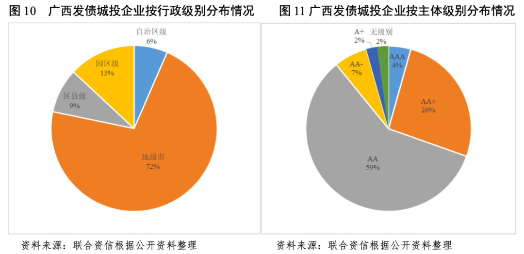 廣西發債城投企業主要為地級市城投企業,區縣城投企業較少,柳州市為廣西發行城投債最多的地區。廣西發債城投企業的信用等級普遍集中在AA級別。