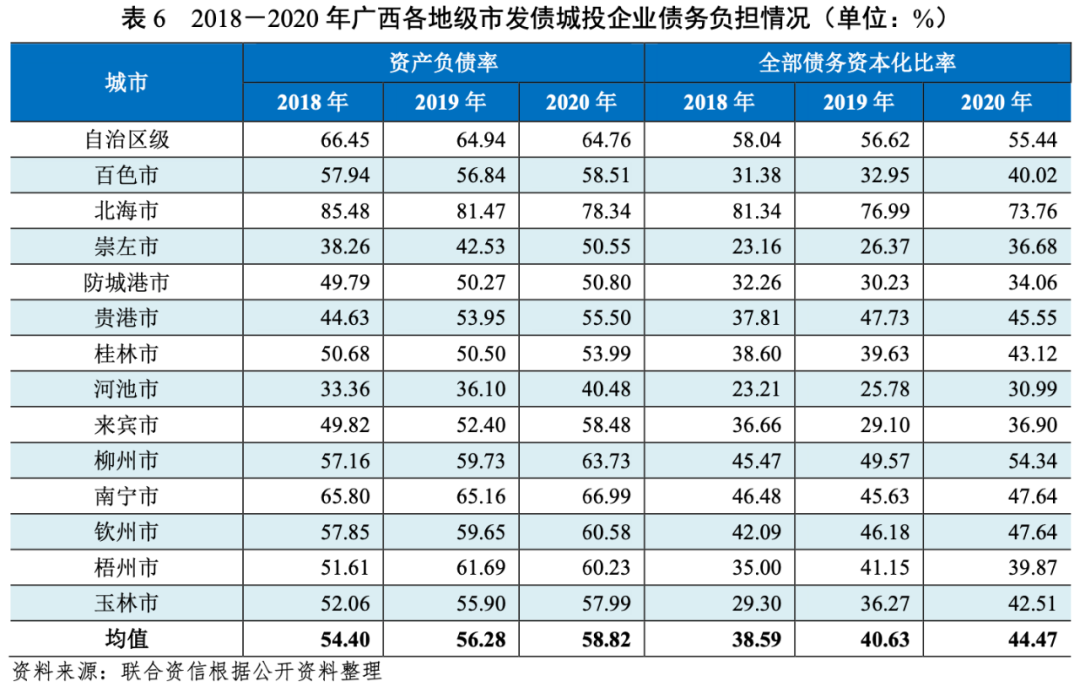 從發債城投企業債務負擔來看,2018-2020年,廣西整體發債城投企業資產負債率和全部債務資本化比率均值呈持續上升趨勢。其中,2018-2020年,自治區級、北海市和柳州市城投企業債務負擔相對較重。