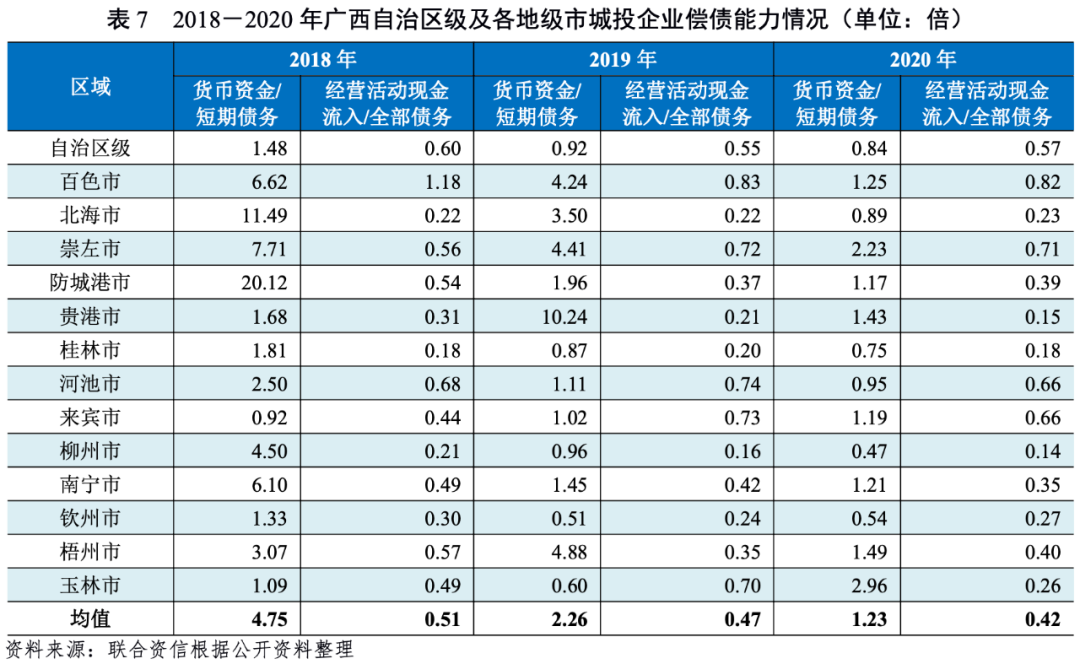 城投企業的經營活動現金流入主要包括業務回款、政府往來款等。2018-2020年,廣西自治區級及各地市城投企業經營活動現金流入/全部債務均值分別為0.51倍、0.47倍和0.42倍,逐年下降。截至2020年底,北海市、貴港市、桂林市、柳州市、欽州市和玉林市城投企業經營活動現金流入對全部債務的覆蓋程度很低,不足0.30倍。