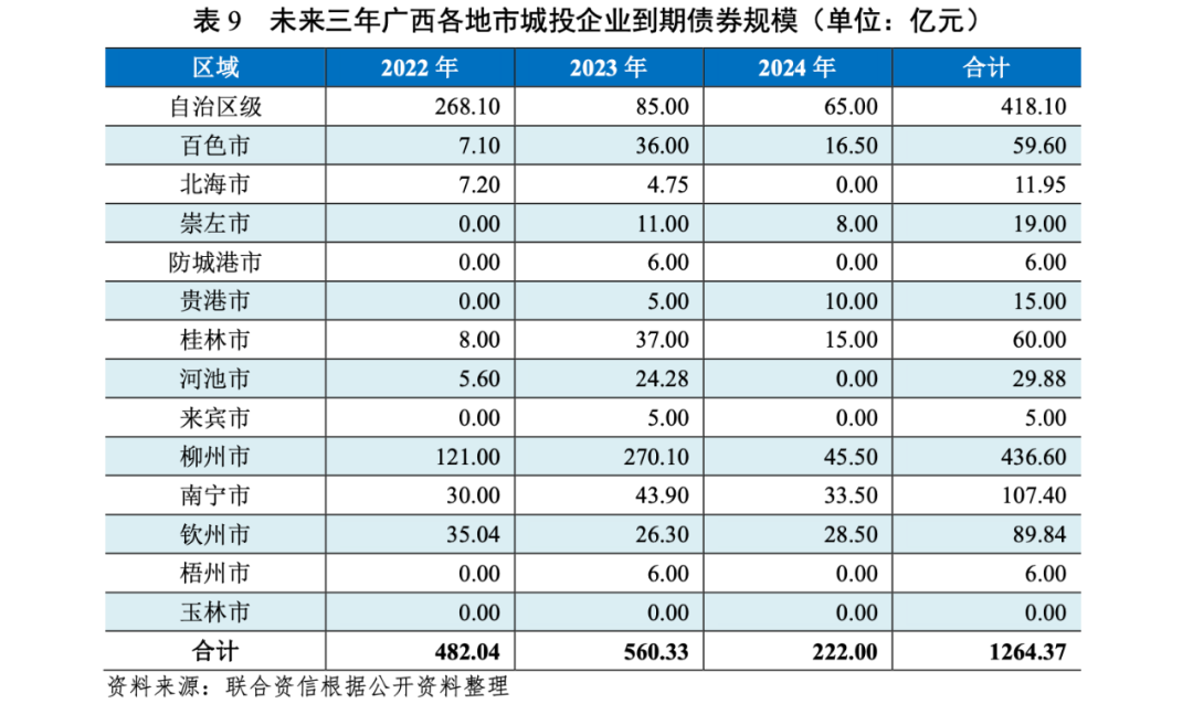 從廣西自治區級及各地市發債城投企業未來三年(2022-2024年)到期債券(包括回售行權部分)規模看,廣西未來三年到期債券規模分別為482.04億元、560.33億元和222.00億元,其中2022年和2023年存在較大集中償付壓力。