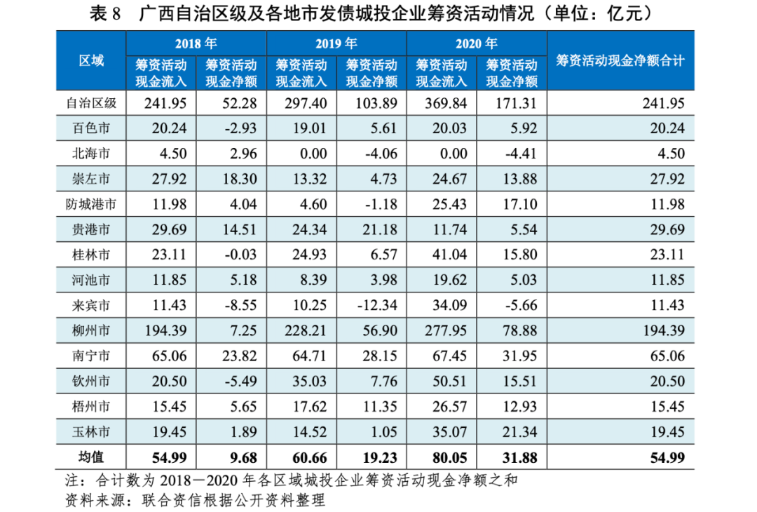 從廣西自治區級及各地市發債城投企業籌資活動凈現金流狀況看,2018-2020年,自治區級、南寧市及柳州市城投企業融資能力明顯強于其他區域。2020年,北海市和來賓市償還了較多債務,籌資活動現金流為凈流出,其他地級市發債城投企業籌資活動現金流均表現為凈流入。