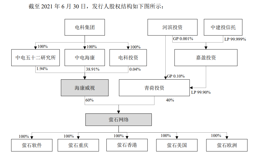 螢石網絡的股權結構較為簡單,其控股股東海康威視直接持有公司60% 的股份。青荷投資是公司另一位股東,截至招股書簽署日持有公司40%的股份。據介紹,青荷投資系海康威視跟投計劃對創新業務進行跟投的持股平臺。
