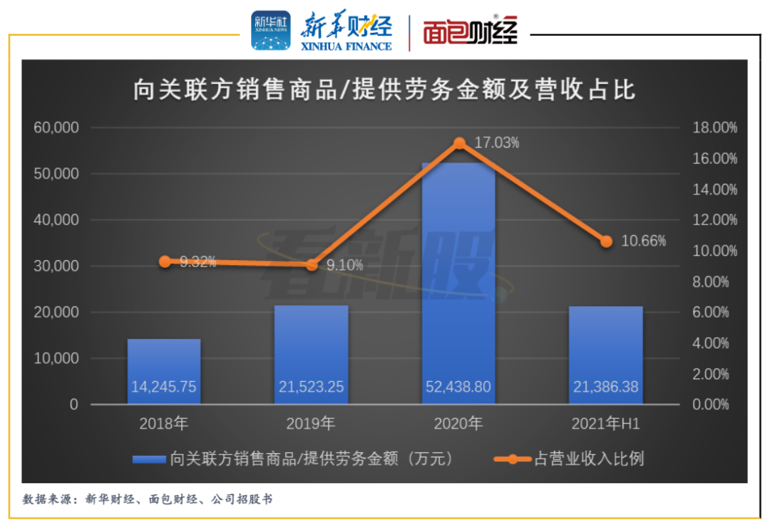 2018年至2021年上半年,螢石網絡向關聯方銷售商品/提供勞務的金額分別達到1.42億元、2.15億元、5.24億元和2.14億元,分別占同期營業收入的9.32%、9.10%、17.03%和10.66%。