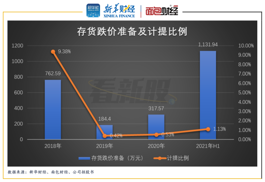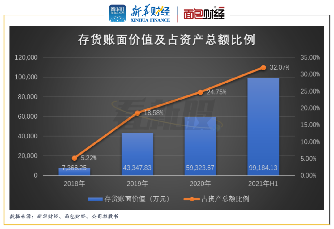報告期內,螢石網絡的存貨賬面價值持續大幅攀升,由2018年7366.25萬元上升至2021年上半年末的99184.13萬元。同期,存貨賬面價值占公司資產總額的比例由5.22%上升至32.07%。