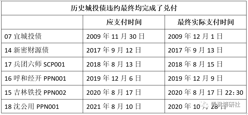 (二)事實(shí)上,過(guò)去多筆城投違約事件似乎都在循環(huán)著這一過(guò)程。例如,07宜城投債、14新密財(cái)源債、17兵團(tuán)六師SCP001、16呼和經(jīng)開(kāi)PPN001、15吉林鐵投PPN002、18沈公用PPN001等前期違約的債券最終均完成了兌付。