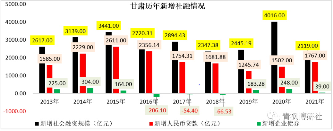 我們梳理了2013年以來(lái)甘肅地區(qū)的歷年新增社融和人民幣貸款情況。整體整體上看,除2020年這一特殊年份外,金融體系對(duì)甘肅體系的支持支持力度實(shí)際上是在不斷減弱,也即金融體系對(duì)甘肅地區(qū)的認(rèn)可度呈逐步下降態(tài)勢(shì)。例如,2021年全年,甘肅全省的新增社融與人民幣貸款分別為2119億元和1767億元,,明確低于2014-2017年的水平,新增社融體量更是創(chuàng)下了新低紀(jì)錄。