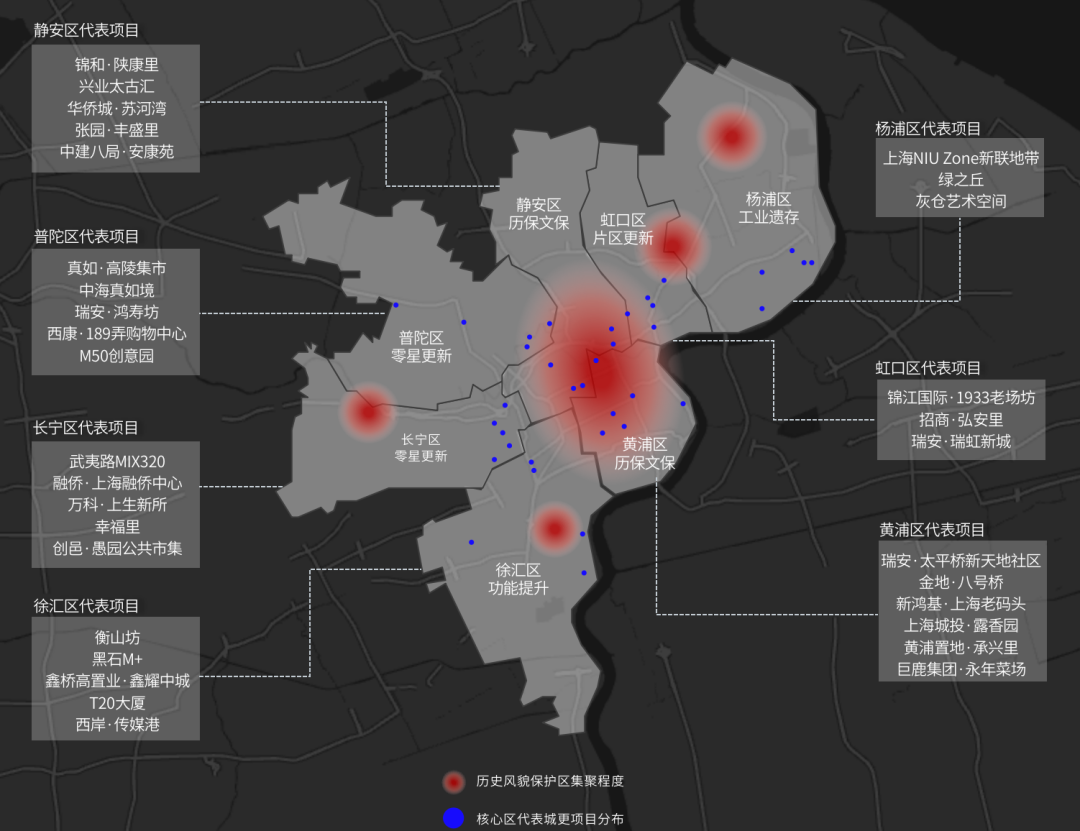 圖:上海歷史風(fēng)貌保護區(qū)集聚程度及各區(qū)代表城更項目