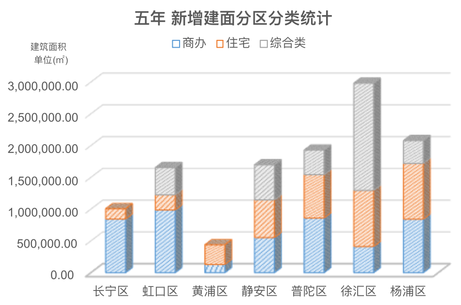 圖:近五年上海核心區(qū)范圍內(nèi)新增建面分區(qū)分類統(tǒng)計