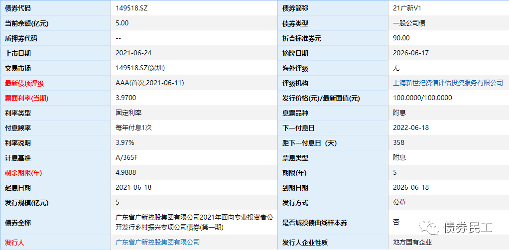 1、2021年6月16日,廣東省廣新控股集團有限公司發行的2021年面向專業投資者公開發行鄉村振興專項公司債券(第一期),成為交易所市場發行的首單鄉村振興公司債券。本期公司債券的債券簡稱為21廣新V1,發行規模為5億元,發行期限為5年,票面利率為3.97%。