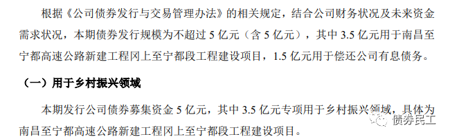 根據21贛交V1募集說明書公開披露的材料,本期債券的募集資金用途為3.5億元用于用于南昌至寧都高速公路新建工程岡上至寧都段工程建設項目,1.5 億元用于償還公司有息債務。也就是說,本期債券的募集資金用于鄉村振興的為總募集資金的70%。