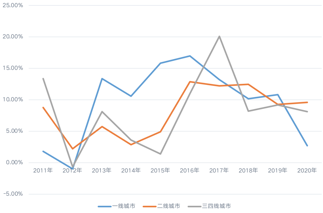 圖:全國百城2011-2020年新建商品住宅成交均價同比漲幅