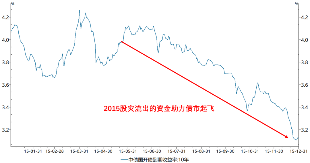 2015股市的大跌使得資金迅速投向固收市場(chǎng)避險(xiǎn),股債蹺蹺板效應(yīng)明顯。在股市流出資金的帶動(dòng)下,債券市場(chǎng)結(jié)束調(diào)整,10年期國(guó)開(kāi)債迎來(lái)了一波100bp的大牛市。