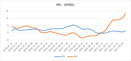 據(jù)國家統(tǒng)計局數(shù)據(jù)顯示,10月PPI再次創(chuàng)下歷史新高,達13.5%;CPI同比上漲1.5%,較上月回升0.8%,與PPI剪刀差處于歷史最高位。