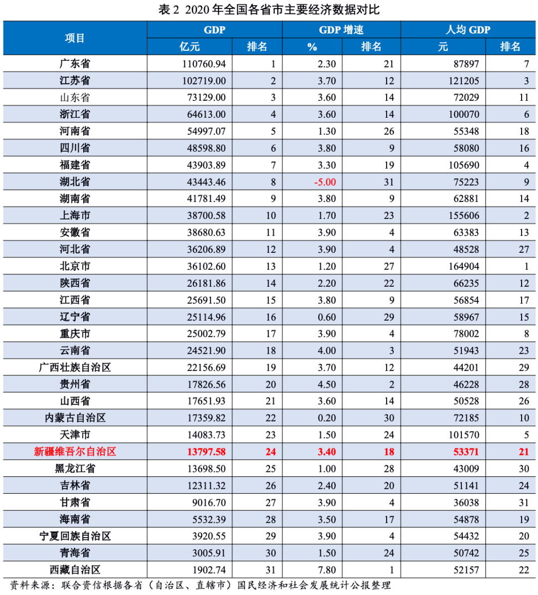 從GDP增速看,2020年,新疆各地級市(自治州、地區)GDP增速差別較大,其中經濟總量最高的烏魯木齊市GDP增速僅為0.3%,伊犁州直、博州、昌吉州、阿克蘇地區、和田地區2020年GDP增速相對較高,介于5~6%之間。