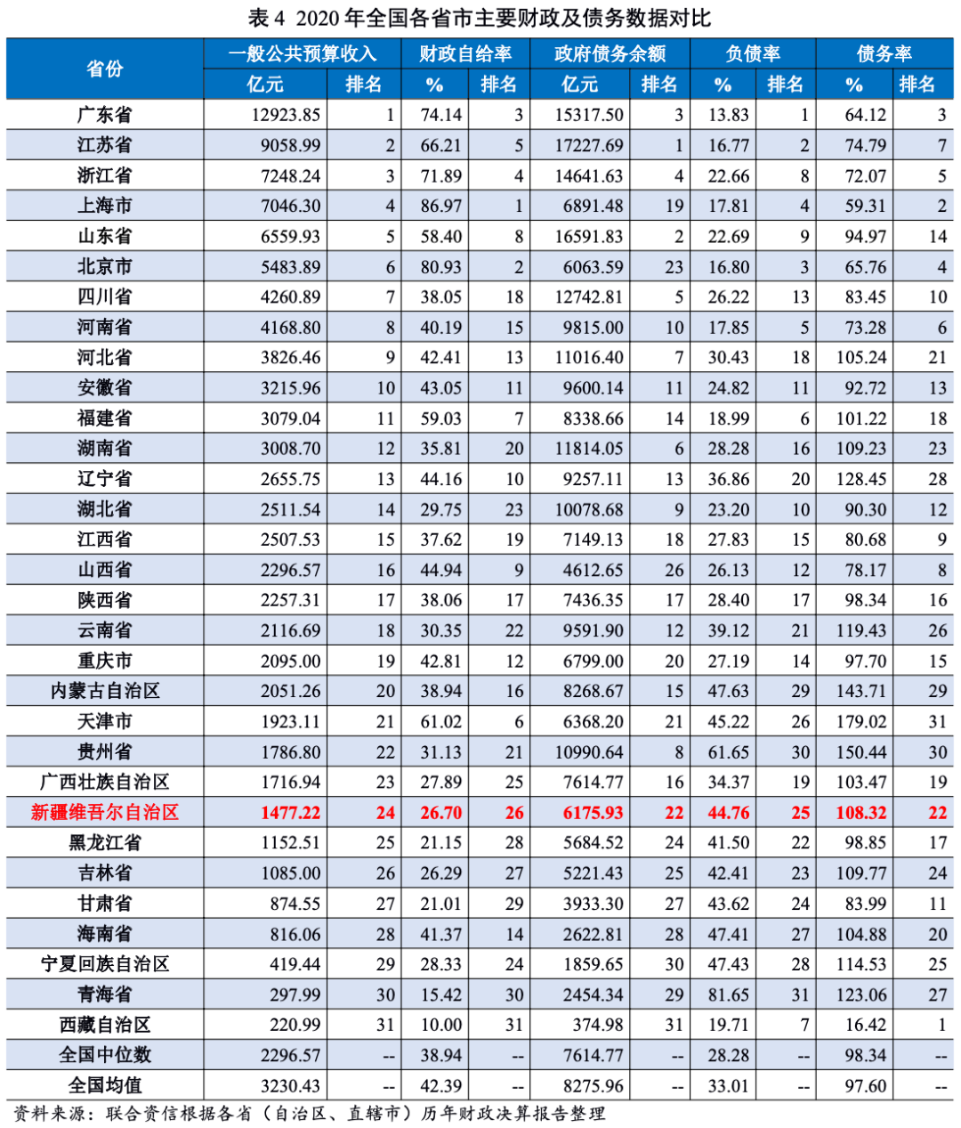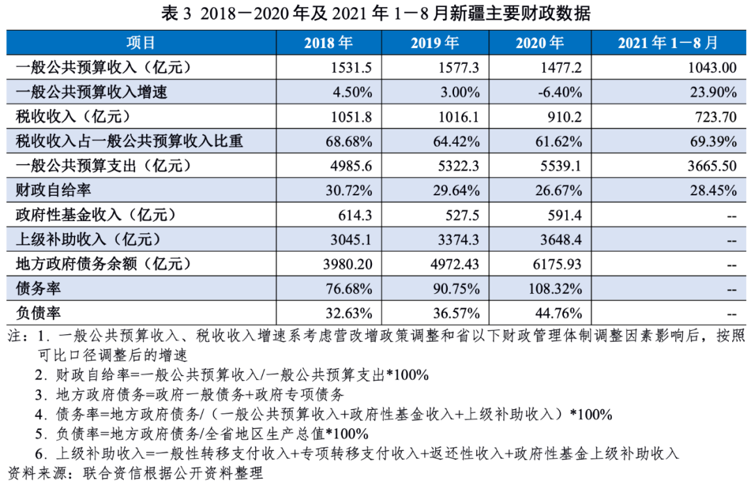 新疆一般公共預算收入居于全國中下游水平,財政自給能力較弱,政府性基金收入占新疆綜合財力的比重不高,地方可用財力對上級補助的依賴程度高。新疆政府債務余額在全國排22位,負債率和債務率在全國排名中下游水平,政府債務負擔處于可控范圍。