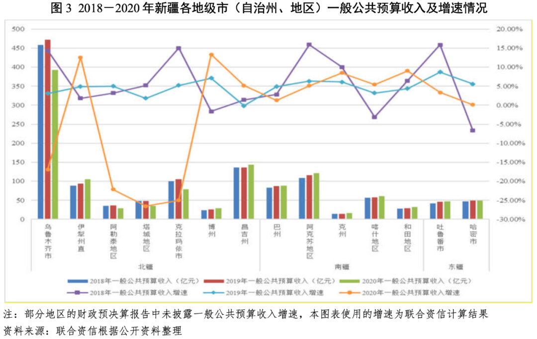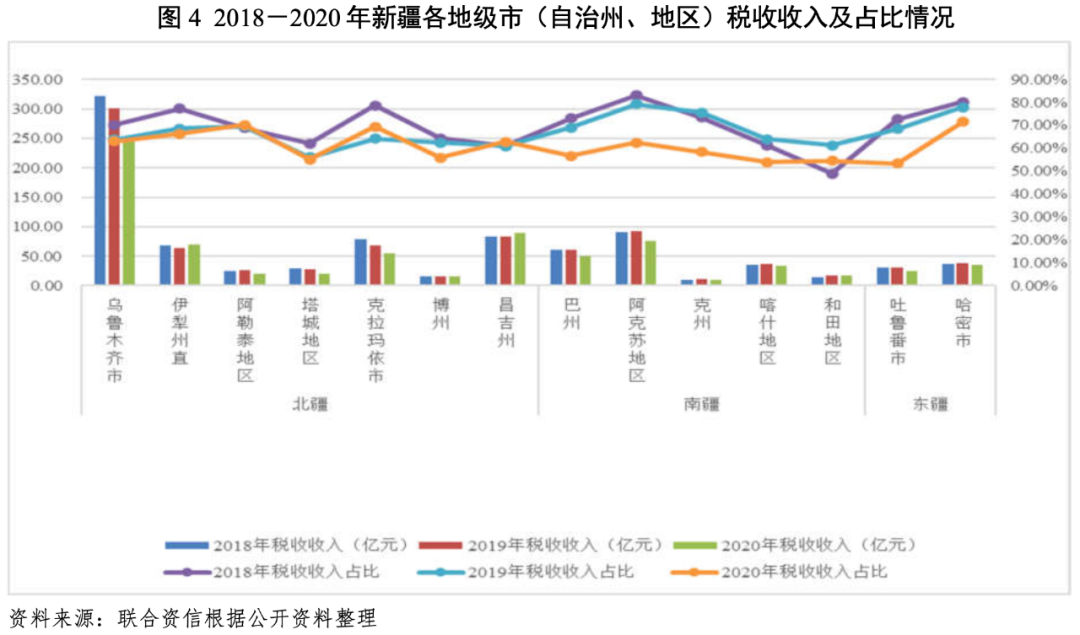 新疆各地級市(自治州、地區)一般公共預算收入規模差異較大。2018-2020年,北疆的烏魯木齊市、伊犁州(伊犁州直、阿勒泰地區和塔城地區合計)和昌吉州的一般公共預算收入明顯高于其余地級市(自治州、地區),均超過100億元。此外,位于南疆的阿克蘇地區一般公共預算收入也超過100億元,克拉瑪依市、巴州和喀什地區一般公共預算收入位于50~100億元之間,其余地級市(自治州、地區)的一般公共預算收入均不足100億元。