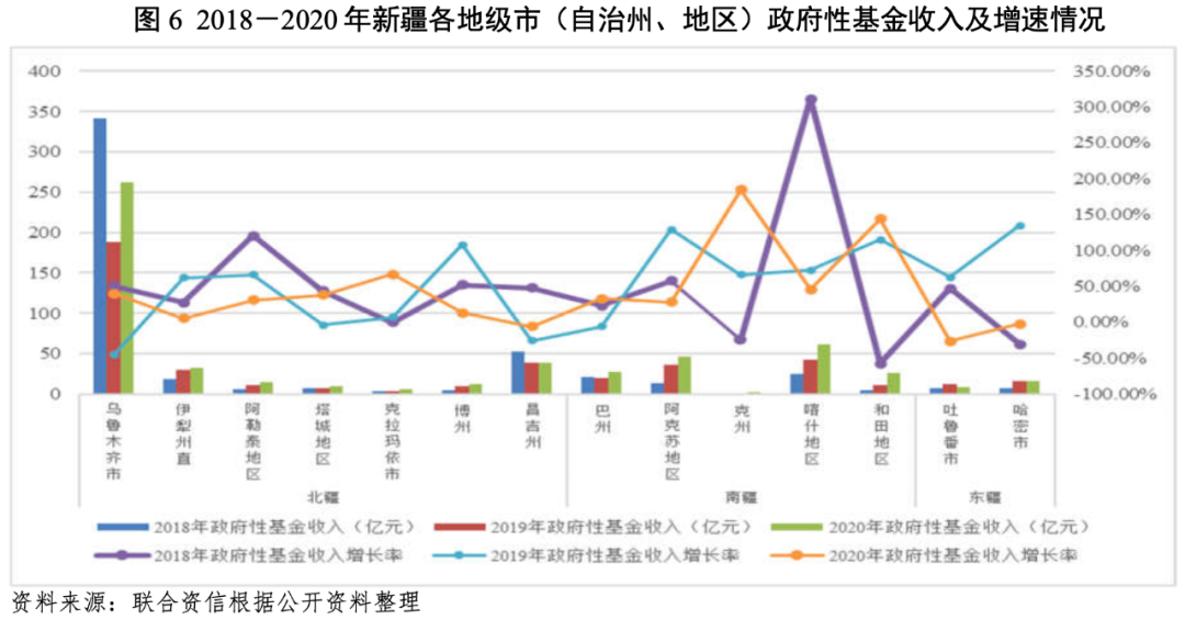 政府性基金收入方面,新疆的政府性基金收入主要集中在烏魯木齊市,2018-2020年烏魯木齊市的政府性基金收入占全新疆的55.68%、35.57%和44.40%。其余地級市(自治州、地區)的政府性基金收入較低。