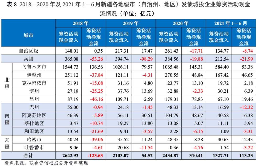 截至2021年6月末,自治區級、喀什地區和烏魯木齊市發債城投企業資產負債率均在70%以上,省級、兵團、烏魯木齊市和昌吉州發債城投企業全部債務資本化比率均在50%以上,債務負擔相對較重。