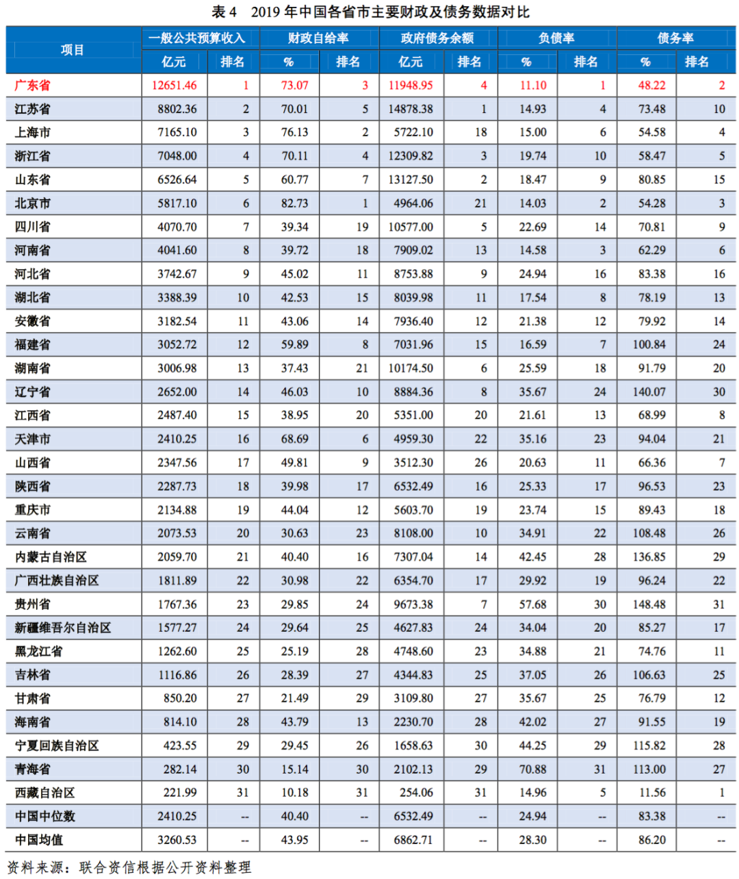 2019年廣東省一般公共預算收入在中國排名第一,一般公共預算收入穩定性強且財政自給率較高,整體財政實力很強。廣東省政府負債率在中國排名第一(按照債務負擔輕重排序),政府負債水平很低,地方政府債務負擔很輕;政府債務率排名前列(按照償債能力強弱排序),償債能力很強。