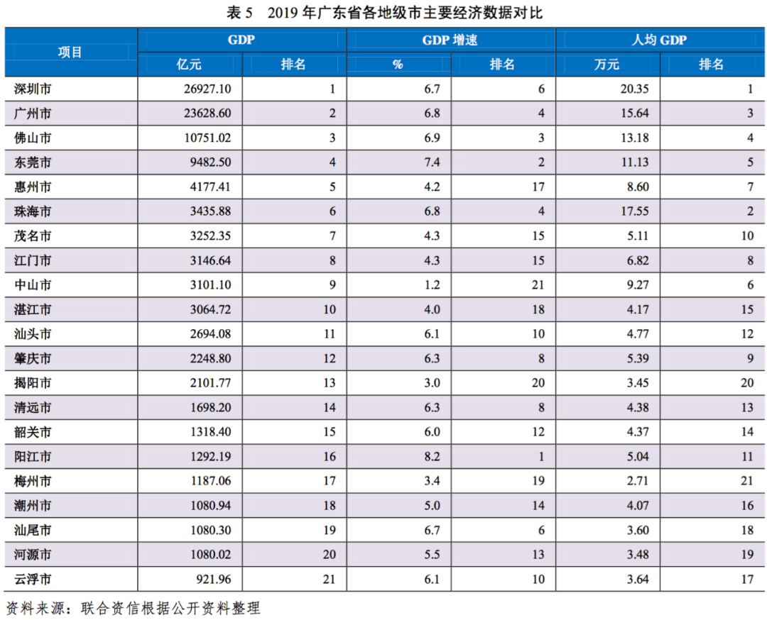 從GDP增速來看,2019年深圳市、廣州市、東莞市和佛山市等12個地級市GDP增速達到6%及以上,河源市及潮州市GDP增速在5%~6%之間,其余各地級市GDP增速低于5%。整體上,廣東省各地級市GDP仍維持較高的增速,未來城市發展格局較為穩定。