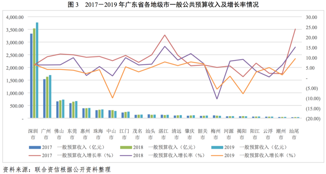 廣東省是中國開放程度最高、經濟活力最強的區域之一,經濟總量長期位居中國第一,人均GDP在中國名列前茅,受國家經濟發展政策支持力度大,經濟發展態勢良好。2019年,廣東省財政收入排名中國第一,且大幅領先其他省市,一般公共預算收入穩定性強,財政自給程度較高,整體財政實力很強。2019年廣東省政府負債率為11.10%,與其他省市相比,政府債務負擔很輕;廣東省政府債務率為57.60%,償債能力很強。