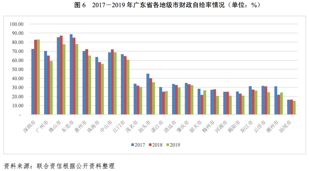 2017-2019年,受減稅降費及增加民生支出影響,除深圳市及中山市財政自給率有所上升外,其余各地級市財政自給率均有所下降;分區域看,除肇慶市外,2019年珠三角地區其余各地級市財政自給率普遍在55%以上,沿海經濟帶及北部生態發展區各地級市財政自給率普遍在40%以下。總體看,珠三角地區各地級市財政自給能力強,沿海經濟帶及北部生態發展區各地級市財政自給能力偏弱。