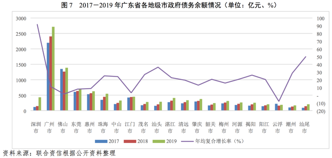 從債務層面看,廣東省各地級市中,廣州市及佛山市政府債務余額最大,規模在1000億以上,其次是東莞市、惠州市、珠海市、江門市、深圳市和湛江市,上述6個地級市政府債務余額均在400億以上。2017-2019年,除云浮市外,其余各地級市政府債務余額均有所增長,其中深圳市及汕尾市政府債務余額增長最快,年均復合增長率分別為91.57%和49.80%;珠海市、茂名市、揭陽市及汕頭市等政府債務余額年均復合增長率達到25%以上。