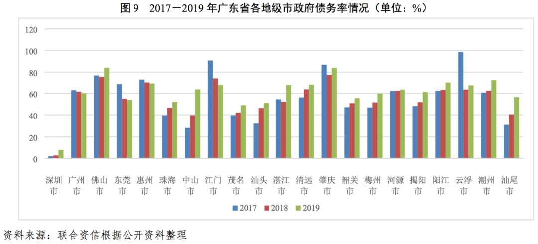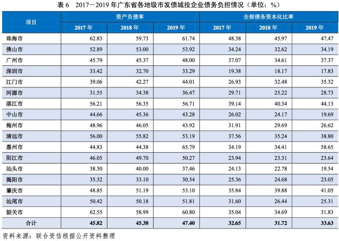 從各地區債務負擔來看,“發債城投企業全部債務+地方政府債務”/GDP較高的地級市為珠海市,2019年底為62.85%,其余各地級市均未超過35%,債務負擔相對較輕。
