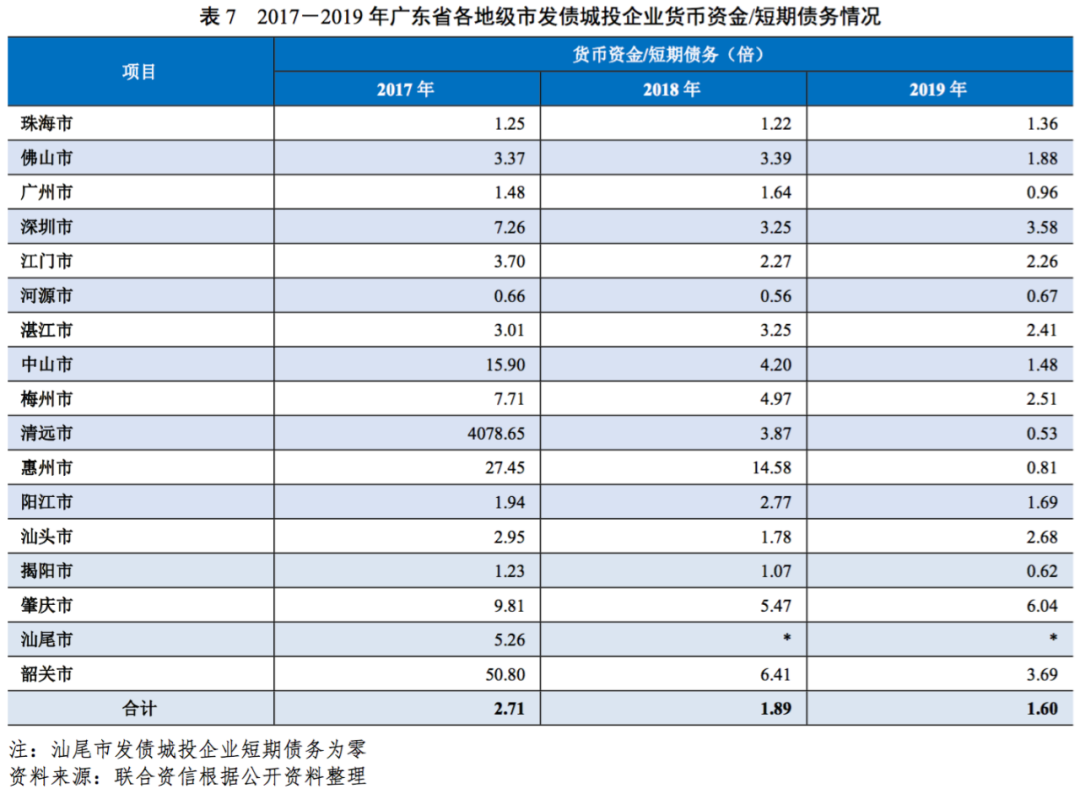 2019年,廣東省發債城投企業債務負擔有所加重。各地級市發債城投企業債務償還仍主要依賴于外部籌資,且受債務集中到期影響,短期償債能力指標有所弱化,償債壓力持續加大;廣州市、深圳市和珠海市發債城投企業未來三年集中到期債券規模大,其中珠海市發債城投企業2021年到期債券集中償付壓力較大,需關注面臨集中償付壓力和地方政府債務負擔重的地級市區域內城投企業的再融資情況。