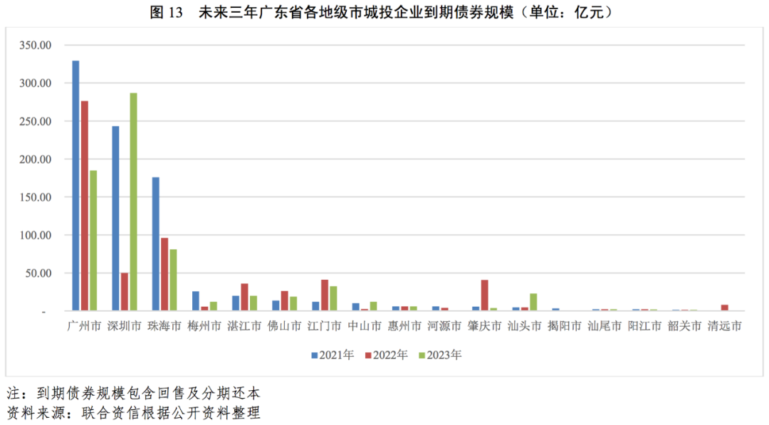 從廣東省各地級市發債城投企業未來三年(2021-2023年)到期債券規模看,廣州市、深圳市和珠海市發債城投企業未來三年集中到期債券規模大,其余各地級市發債城投企業到期債券規模相對較小。