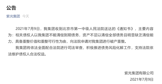 2021年7月9日,紫光集團(tuán)發(fā)布公告稱,收到北京市第一中級人民法院送達(dá)的《通知書》,主要內(nèi)容為:相關(guān)債權(quán)人以紫光集團(tuán)不能清償?shù)狡趥鶆?wù),資產(chǎn)不足以清償全部債務(wù)且明顯缺乏清償能力,具備重整價(jià)值和重整可行性為由,向法院申請對紫光集團(tuán)進(jìn)行破產(chǎn)重整。