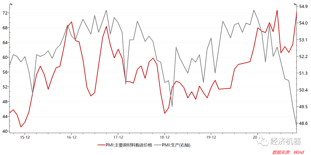 上周,官方PMI公布,制造業PMI為49.2,連續2個月低于50分界線以下,連續7個月出現放緩。分項中,生產、訂單等“量”相關的指標繼續下滑,而原材料價格等“價”相關的指標大幅攀升,過去一段時間以來兩者持續分化的趨勢達到了一個新的水平。