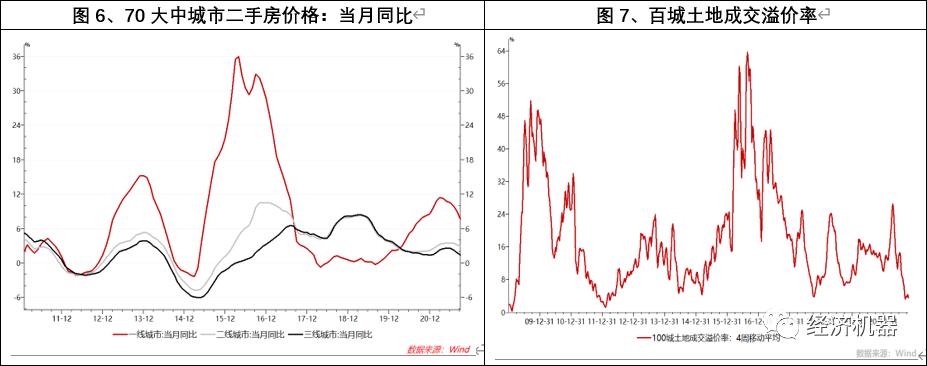 2)全國各線城市房價出現同步回落,土地市場遇冷,種種跡象表明,房地產市場或將進入一個下行周期。2015年-2016年,房地產市場處于同步上漲階段,一線漲幅領先于二線,二線領先于三四線。2017-2020年間,各線城市之間出現分化。2021年下半年以來,多因素沖擊下,一二三四線房價同步出現回落;同時土地市場急速轉涼,土地溢價率接近于0,各地流拍現象不斷上升,種種跡象表明,房地產市場在快速轉涼,有可能進入一個較長階段的同步下行周期。