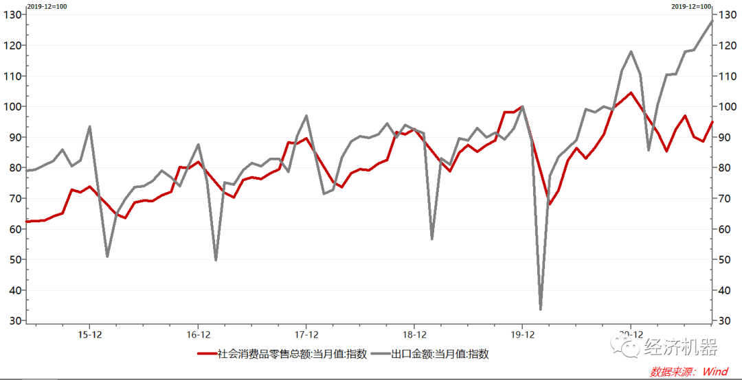 在“滯脹”前景的研判上,市場對明年經濟出現周期性放緩的預期較為一致。疫情至今,外貿出口和房地產投資兩大動力率先復蘇,助推我國經濟持續復蘇;而“消費”和“固定資產投資(制造業和基建)”復蘇相對滯后。