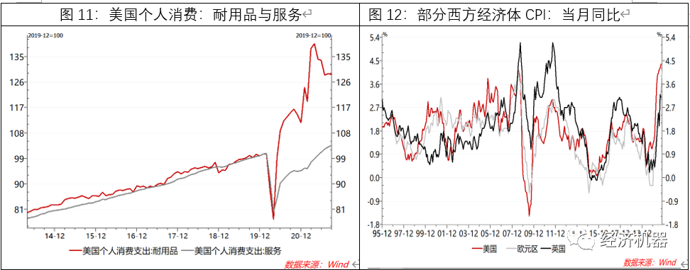 海外需求沖擊帶來的輸入性通脹。疫情期間,以美國為首的西方國家推出了大力度的財政刺激措施,包括向民眾派發現金,導致居民儲蓄率和購買力大幅提高。隨著疫苗接種,需求領先于供給而恢復,耐用消費品需求更是出現“井噴”,速度遠快于服務消費(圖11),加劇了其國內的大通脹(圖12)。由于耐用品多屬于貿易品,通過國際貿易形式,向我國輸入了通脹壓力。