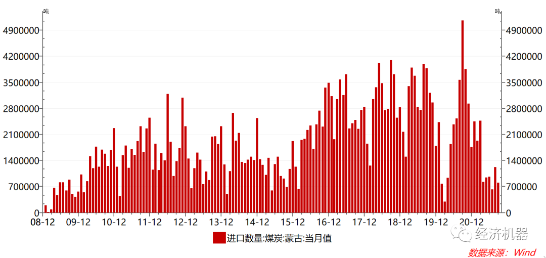 圖10:2021年蒙古煤炭進口:過于嚴厲的通關政策下持續下滑