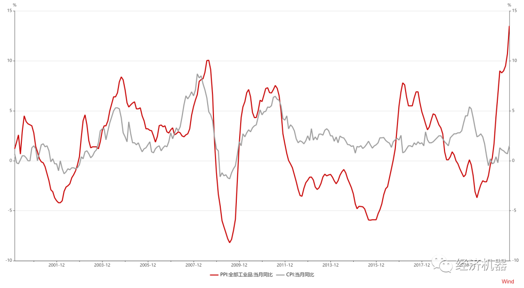 今日,10月通脹數據出爐,CPI、PPI均超預期上漲。其中,CPI受近期食品(豬肉、蔬菜等)價格上漲帶動,加速上行,同比上漲1.5%,預期1.3%,較前值提升0.9個百分點;PPI則受大宗商品漲價影響,同比繼續大幅上行至13.5%,預期12%,連續3月創有記錄以來歷史新高。