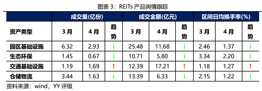 REITs量價回顧:4月延續(xù)回調(diào)趨勢,成交偏清淡。按資產(chǎn)類型看,園區(qū)基礎(chǔ)設(shè)施、生態(tài)環(huán)保以及倉儲物流類REITs的成交額、成交量及日均換手率較3月均有大幅下降,只有交通基礎(chǔ)設(shè)施類REITs較三月有一定上漲。價格走勢來看,11只公募REITs產(chǎn)品在4月中上旬有一定上揚,但下半月回調(diào)明顯,整體呈下跌走勢。