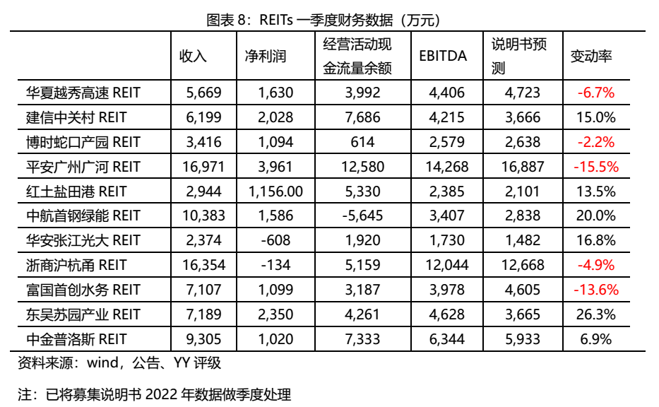 一批基礎(chǔ)設(shè)施公募REITs2022年一季報已經(jīng)披露,總體來看,各只業(yè)績有所分化。9單公募REITs的一季度凈利潤為正,而華安張江光大REIT和浙商滬杭甬REIT分別虧損608萬元、134萬元。華安張江光大REIT系因項目折舊年限較短,本期折舊攤銷較大導(dǎo)致本期虧損,實際上一季度營業(yè)收入穩(wěn)健,而浙商滬杭甬REIT受其高速公路周邊地區(qū)疫情影響,一季度通行車輛總數(shù)同比下降5.93%。另外3只高速公路類REIT、博時蛇口產(chǎn)園REIT受疫情影響,EBITDA不及募集說明書預(yù)期,富國首創(chuàng)水務(wù)REIT受季節(jié)性影響,亦低于募集說明書預(yù)測值的13.6%。除此之外,其他公募REITs整體運營情況良好,EBITDA表現(xiàn)均超預(yù)期。