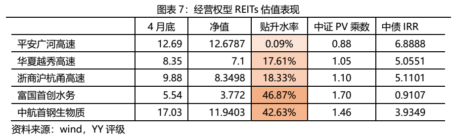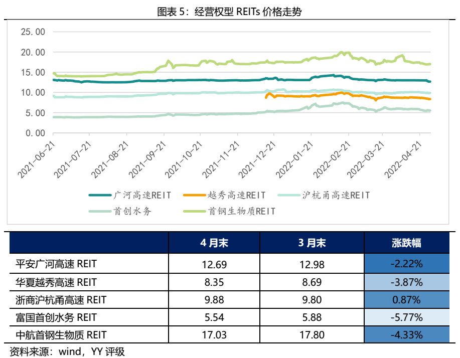 經(jīng)營權(quán)型REITs四月價格走勢基本和產(chǎn)權(quán)型REITs保持一致。跌幅最大的依舊是富國首創(chuàng)水務(wù)REIT,月底收盤價為5.54元,相比于3月底下跌了5.77%;另外浙商滬杭甬高速REIT是唯一一只上漲的產(chǎn)品,月底收盤價為9.88元,相比于3月底上漲了0.87%。