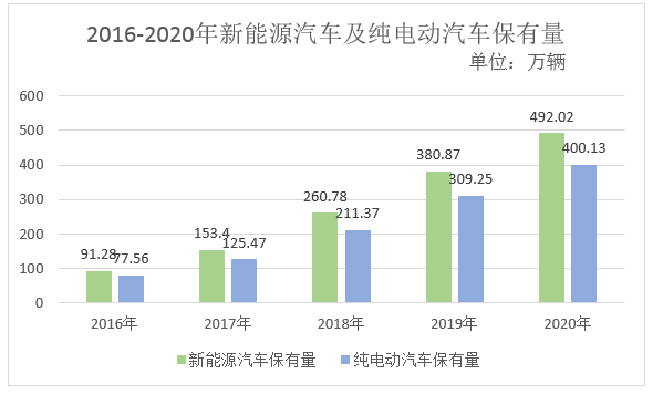 新能源汽車保有量達(dá)492萬(wàn)輛。截至2020年底,全國(guó)新能源汽車保有量達(dá)492萬(wàn)輛,占汽車總量的1.75%,比2019年增加111萬(wàn)輛,增長(zhǎng)29.18%。其中,純電動(dòng)汽車保有量400萬(wàn)輛,占新能源汽車總量的81.32%。新能源汽車增量連續(xù)三年超過(guò)100萬(wàn)輛,呈持續(xù)高速增長(zhǎng)趨勢(shì)。