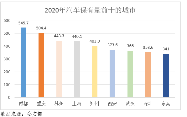 全國(guó)有70個(gè)城市的汽車保有量超過(guò)百萬(wàn)輛,同比增加4個(gè)城市,31個(gè)城市超200萬(wàn)輛,13個(gè)城市超300萬(wàn)輛,其中北京、成都、重慶超過(guò)500萬(wàn)輛,蘇州、上海、鄭州超過(guò)400萬(wàn)輛,西安、武漢、深圳、東莞、天津、青島、石家莊等7個(gè)城市超過(guò)300萬(wàn)輛。