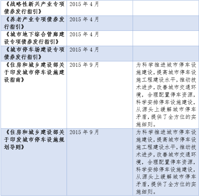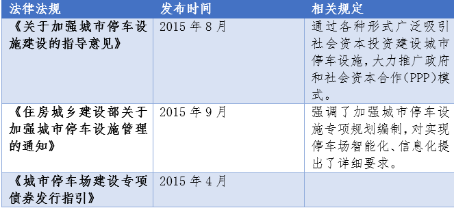 為解決共需矛盾,國(guó)家出臺(tái)了一些列主動(dòng)調(diào)控的手段促進(jìn)停車場(chǎng)產(chǎn)業(yè)的發(fā)展,鼓勵(lì)社會(huì)資本通過(guò)PPP參與立體停車項(xiàng)目、鼓勵(lì)發(fā)行停車場(chǎng)專項(xiàng)債,旨在通過(guò)多元化的手段來(lái)滿足日漸增長(zhǎng)的停車需求。